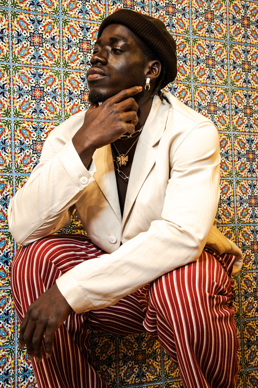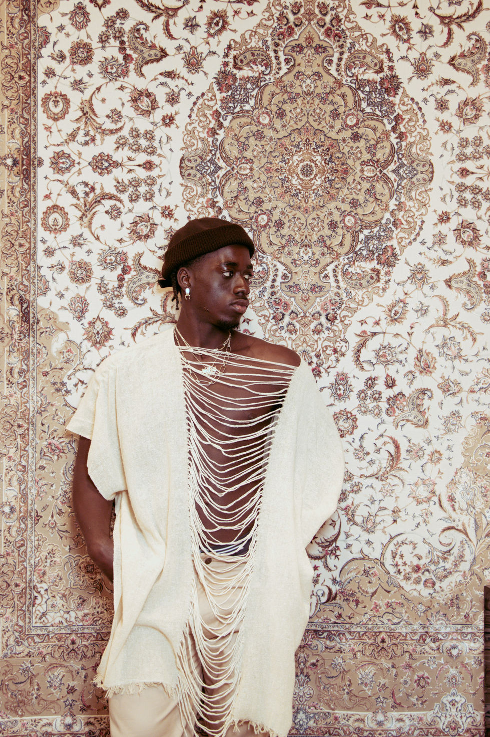 Set within a layered landscape of Persian carpets and ornate surfaces, the editorial creates a visual conversation between contemporary styling and traditional textile culture.